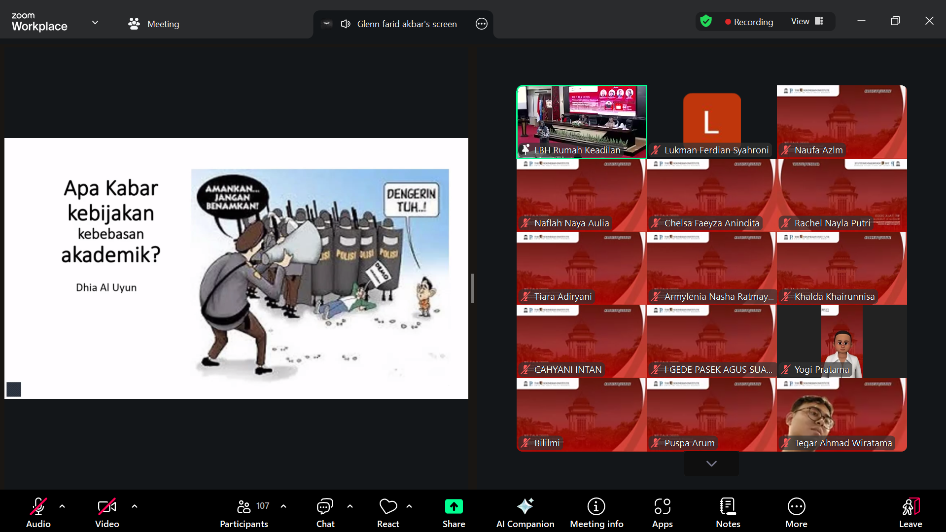 Pemateri kedua, Dr. Dhia Al Uyun, S.H., M.H., selaku Ketua Serikat Pekerja Kampus, menegaskan bahwa kebebasan akademik di Indonesia tengah mengalami kemunduran akibat birokratisasi dan komersialisasi pendidikan. Menurutnya, orientasi kampus yang semakin mirip korporasi mengikis independensi dosen dan mahasiswa serta mempersempit ruang kritis akademik.